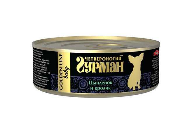 Четвероногий Гурман Golden line Цыпленок и кролик влажный корм для щенков жестяная банка 0,1 кг