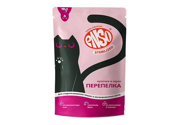 ENSO STERILIZED Корм влажный полнорационный для взрослых стерилизованных кошек, кусочки в соусе с перепелкой, пауч 85г (Без характеристики)