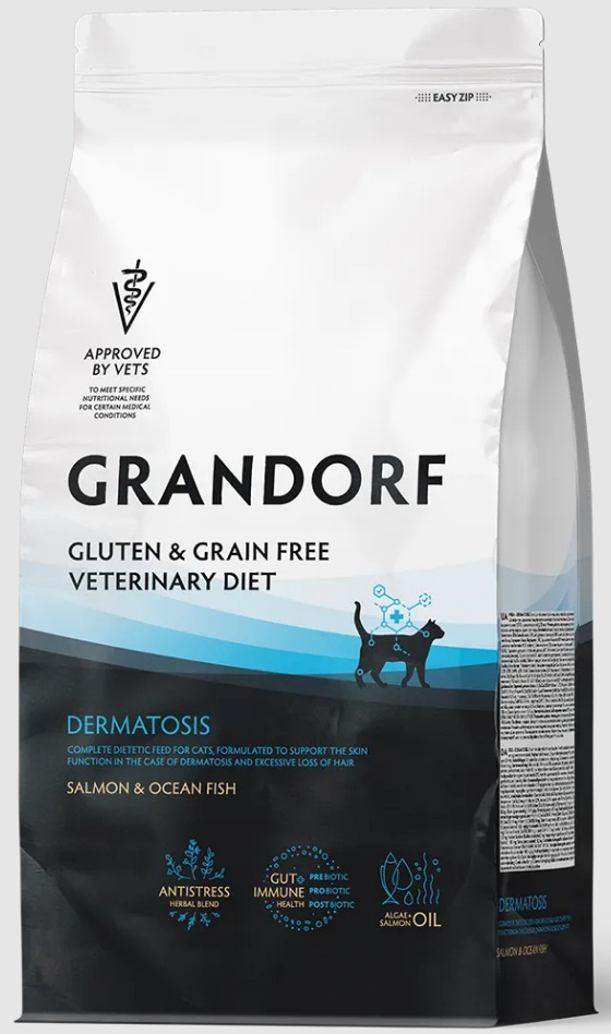GRANDORF VETERINARY DIET SALMON & OCEAN FISH (Рыба) DERMATOSIS 400 г - полнорационный диетический сухой корм для кошек, разработанный для поддержания функций кожи при дерматозах и чрезмерном выпадении шерсти