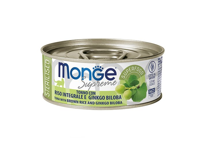 Влажный корм Monge Supreme sterilized для стерилизованных кошек из тунца с бурым рисом и гинкго билоба, консервы 80 г